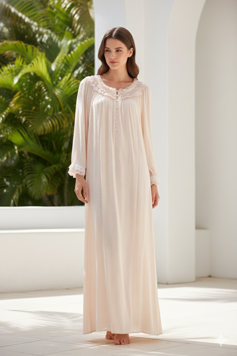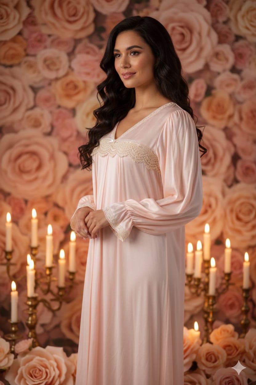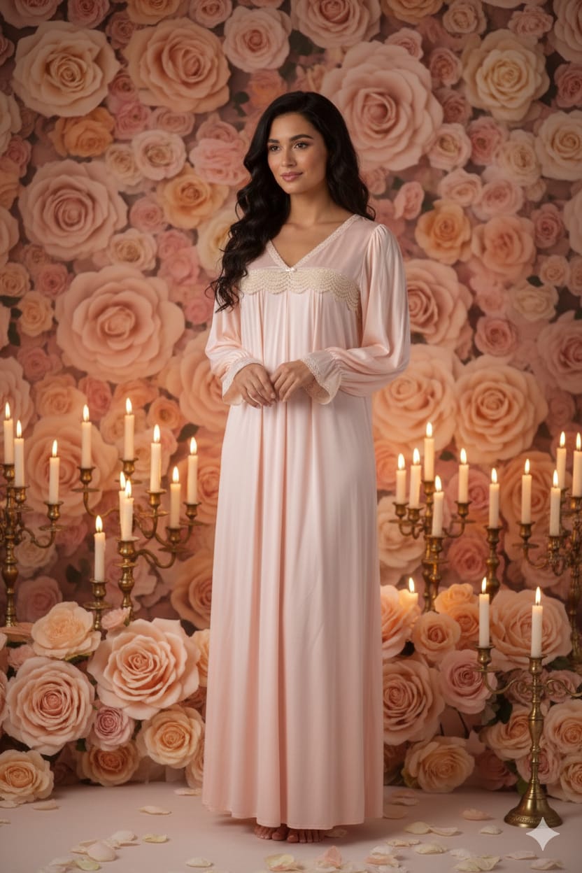 قميص نوم طويل بلون وردي فاتح وبتفاصيل دانتيل ناعمة #1134