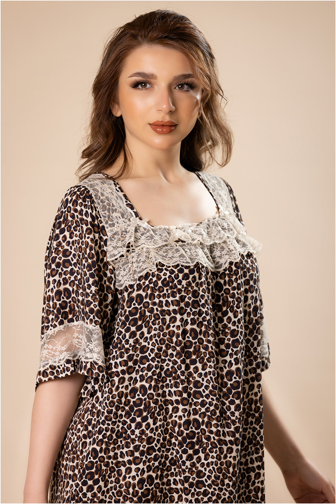 Its elegant design is embellished with fine lace that adorns the chest and sleeves, adding a charming feminine touch reflected in its delicate details.