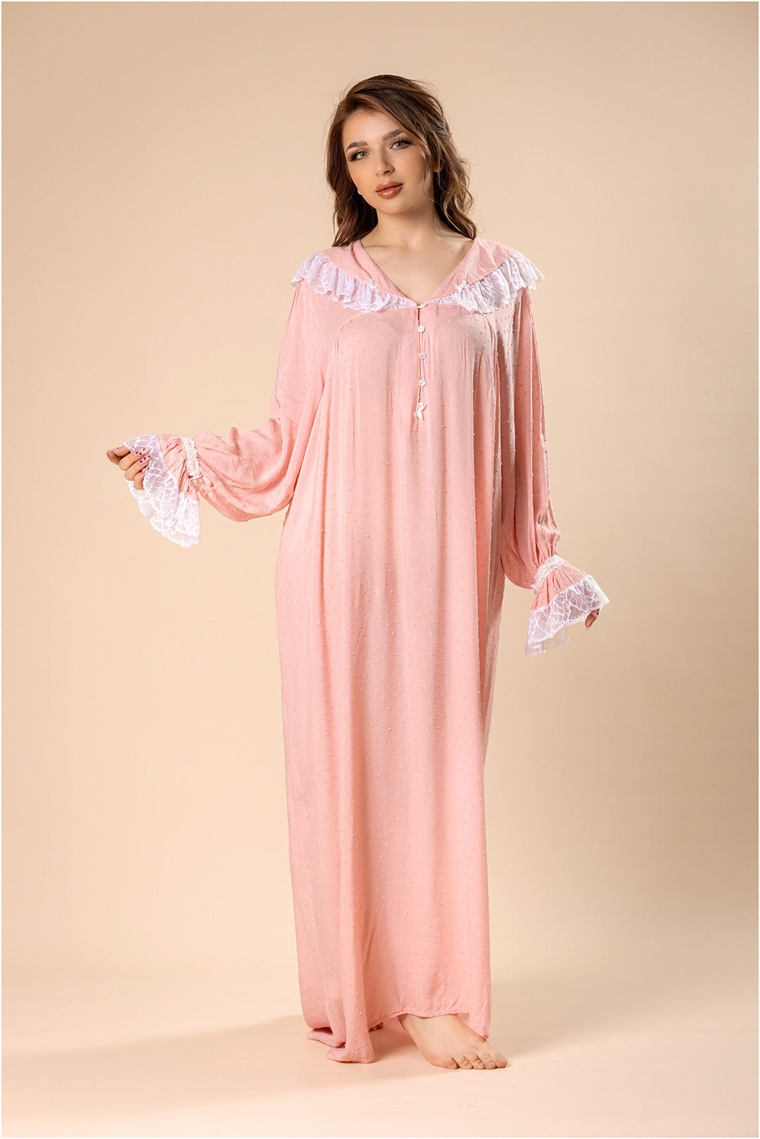 كأنكِ تستيقظين على همسات الصباح الهادئة، تشعرين بملمس القماش الناعم ينساب برقة على بشرتكِ، كعناق دافئ يرافقكِ في أجمل لحظاتكِ. تصميمه بياقة V ينساب برقي، وكأنها إطار يرسم جمالكِ بهدوء، بينما يزين الدانتيل الراقي أطراف الأكمام والصدر، كزهور ناعمة تتفتح بحب.