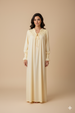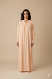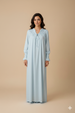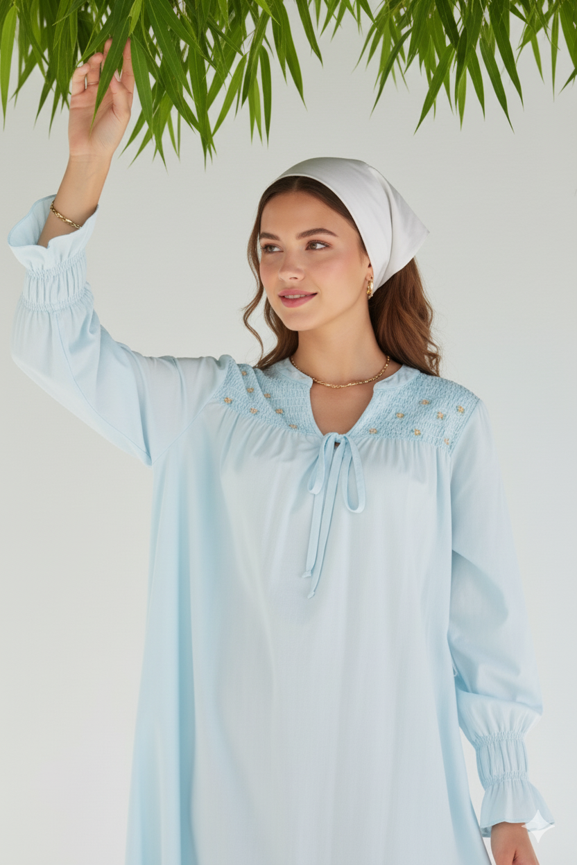 تصميم أنيق ومريح. يتميز بتطريز رقيق عند منطقة الصدر مع عقدة صغيرة تضيف لمسة أنثوية ناعمة. الأكمام طويلة بكرانيش مطاطية عند المعصم لتعطي مظهراً أنيقاً مع راحة في اللبس.