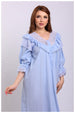 يزدان هذا التصميم بياقة واسعة مزينة بطبقات من الكشكش والدانتيل الناعم لتمنح القميص حضورًا فخمًا.