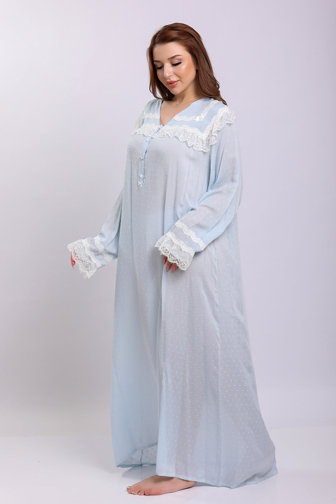 دانتيل أبيض فاخر يزين الصدر والأكمام، ليضفي طابعًا كلاسيكيًا راقيًا.