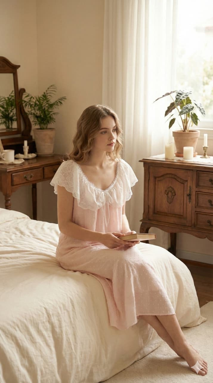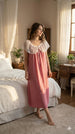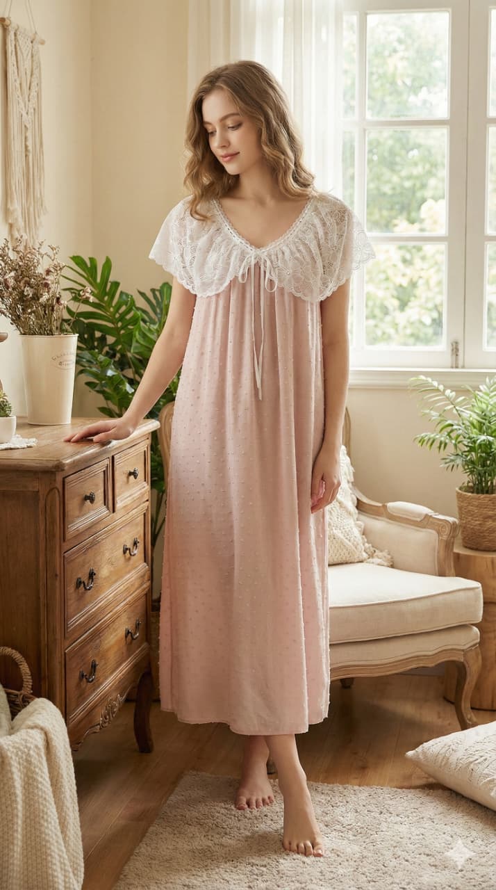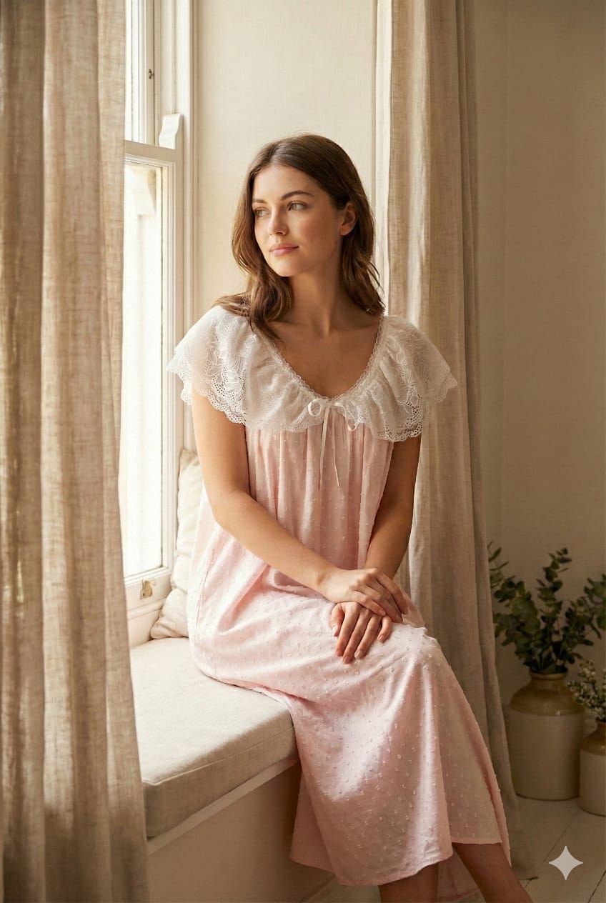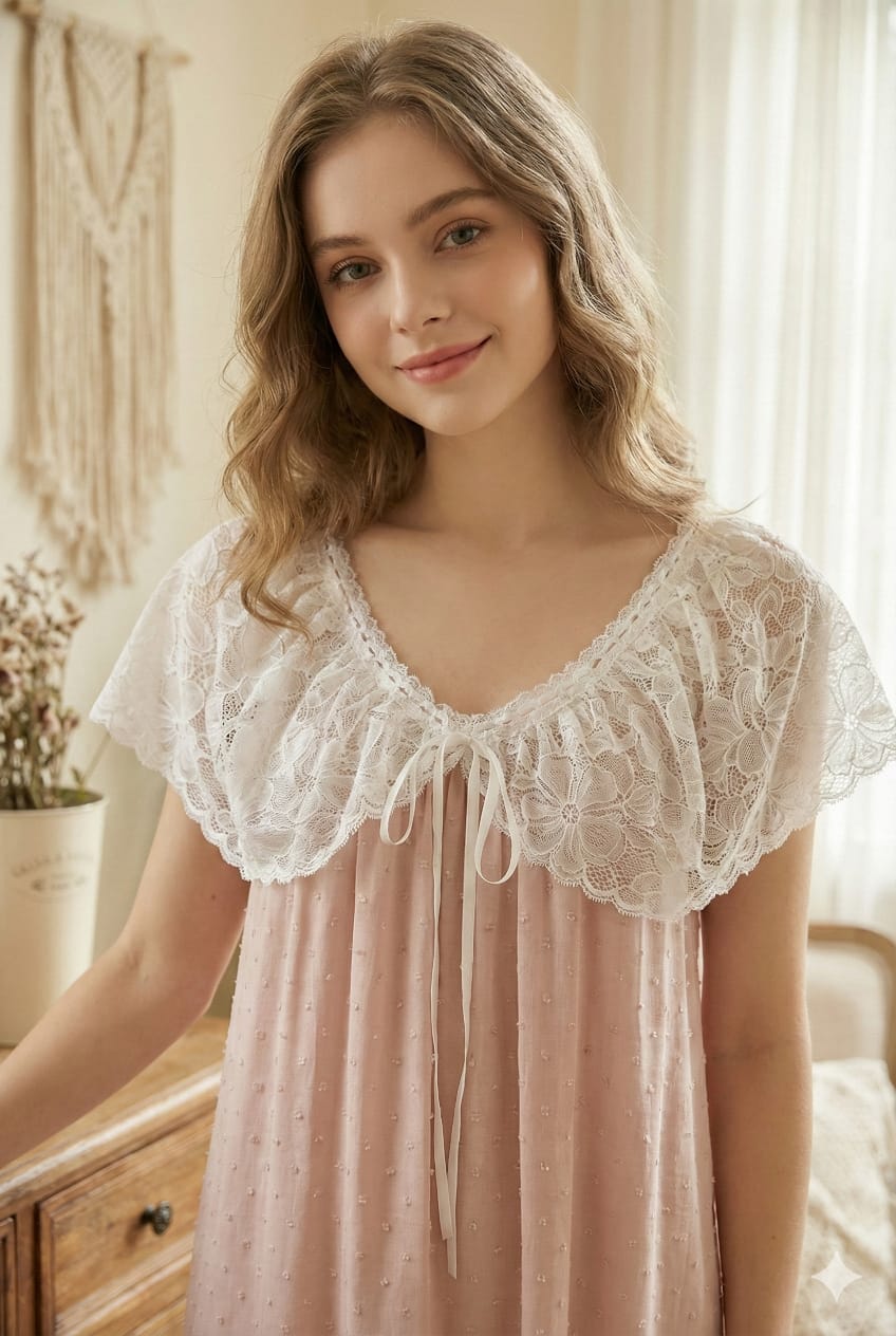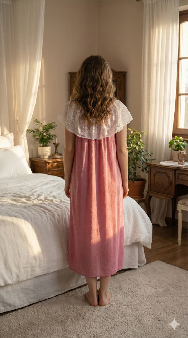 قميص نوم بتصميم أنثوي هادئ، مصنوع من قماش ناعم يسمح بمرور الهواء ليمنح إحساسًا بالراحة طوال فترة الارتداء. يتميز بياقة واسعة مزينة بالدانتيل تضيف لمسة أنيقة وراقية، مع قصة مريحة تناسب الاستخدام اليومي أو الاسترخاء في المنزل..