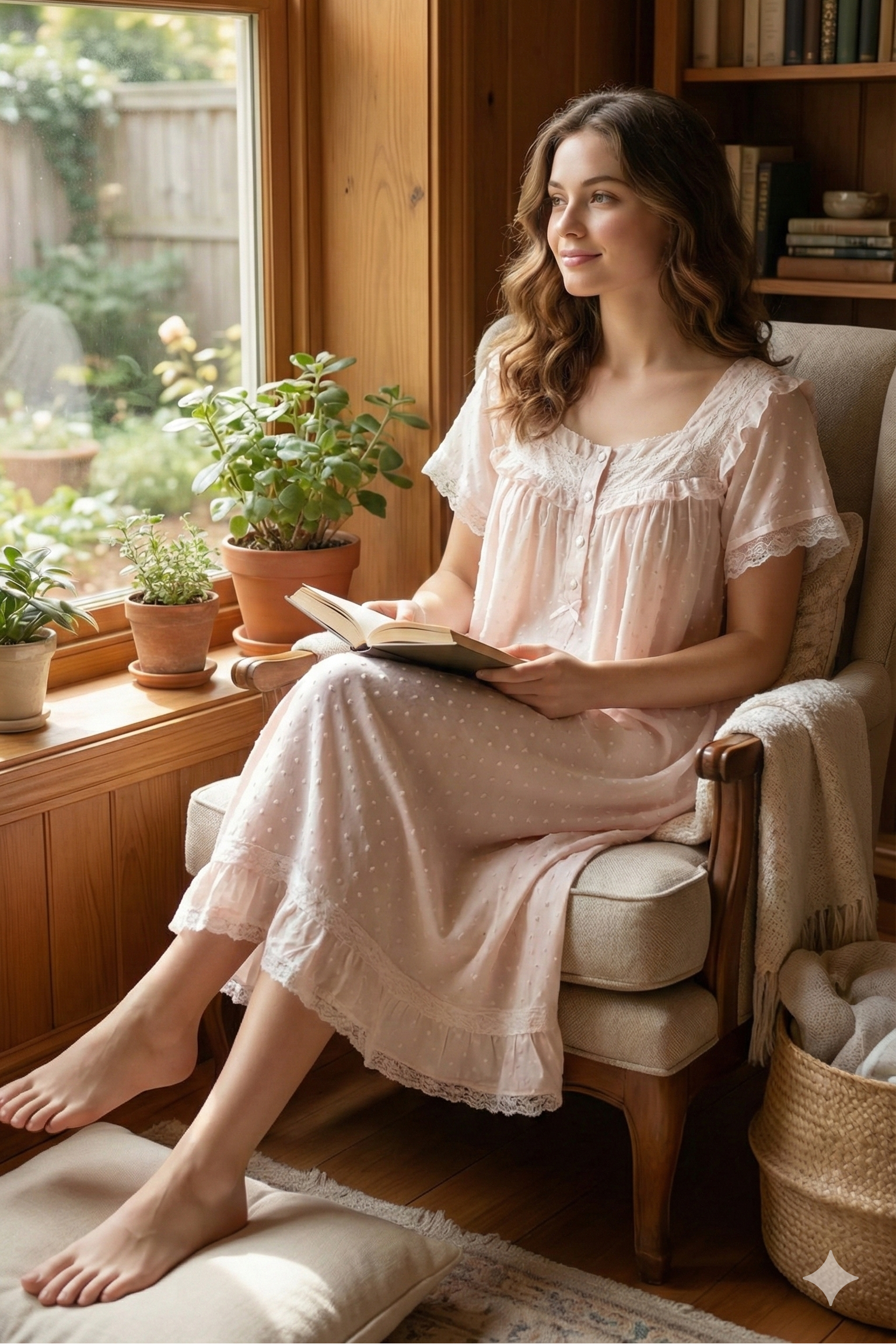 قميص نوم ناعم بطابع رومانسي وهادئ، وبملمس لطيف على البشرة،